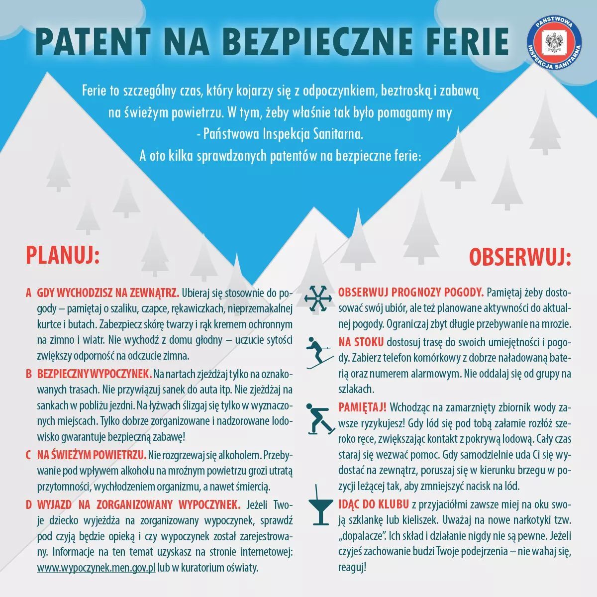 Ferie zimowe są okresem wyczekiwanego odpoczynku od codziennych zajęć, obowiązków i szkoły, a także okazją do beztroskich zabaw na śniegu, jazdy na sankach, łyżwach i nartach. Gwarancją udanego wypoczynku jest przede wszystkim umiejętność zatroszczenia się o zdrowie własne i najbliższych. Aby zminimalizować ryzyko najpopularniejszych niebezpieczeństw i aby czas zimowego wypoczynku dostarczał niezapomnianych wrażeń pamiętajmy o podstawowych zasadach bezpieczeństwa.